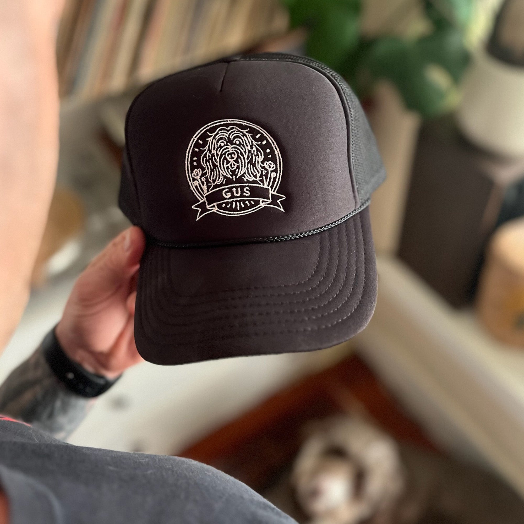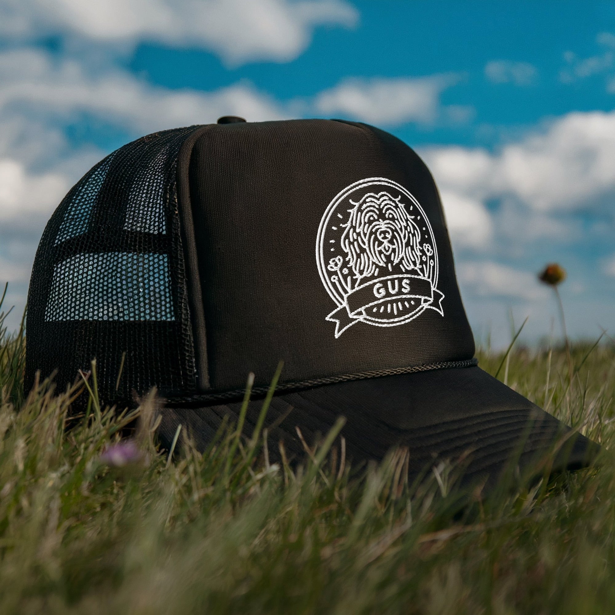 Personalized trucker hat, one-of-a-kind dog portrait