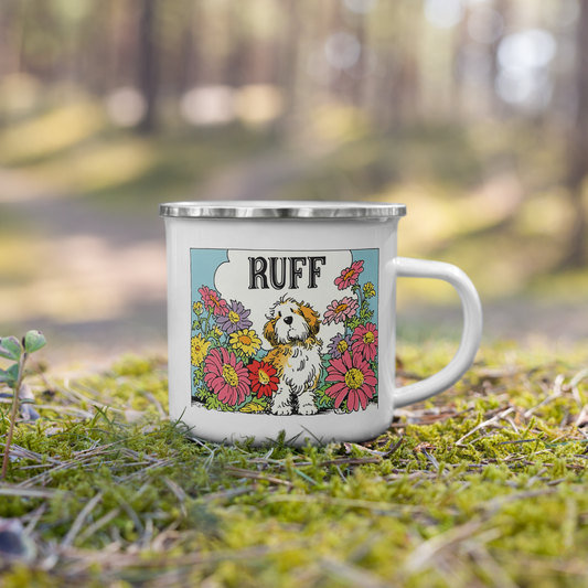 Ruff in Bloom: Vintage-Inspired Dog in Flowers Enamel Mug