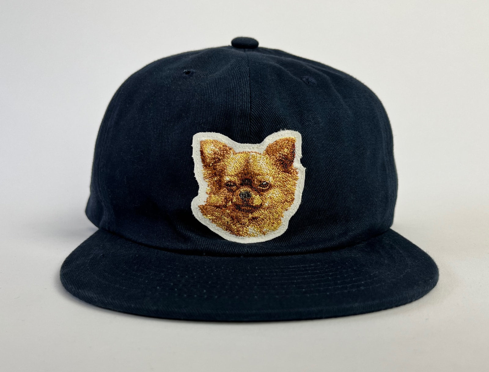 Navy unstructured hat with Chihuahua patch. This timeless hat is made of cotton fabric and features a fabric strap with brass metal clasp.