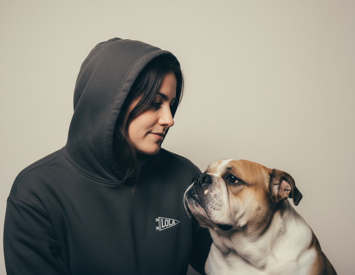 Each piece is individually numbered. The front features a small embroidered vintage pennant — stitched with “RUFF,” or made uniquely yours with your dog’s name in a custom design. On the back, you’ll find a vintage-inspired design featuring the signature RUFF trio — Hendricks, Winston, and Poppy.