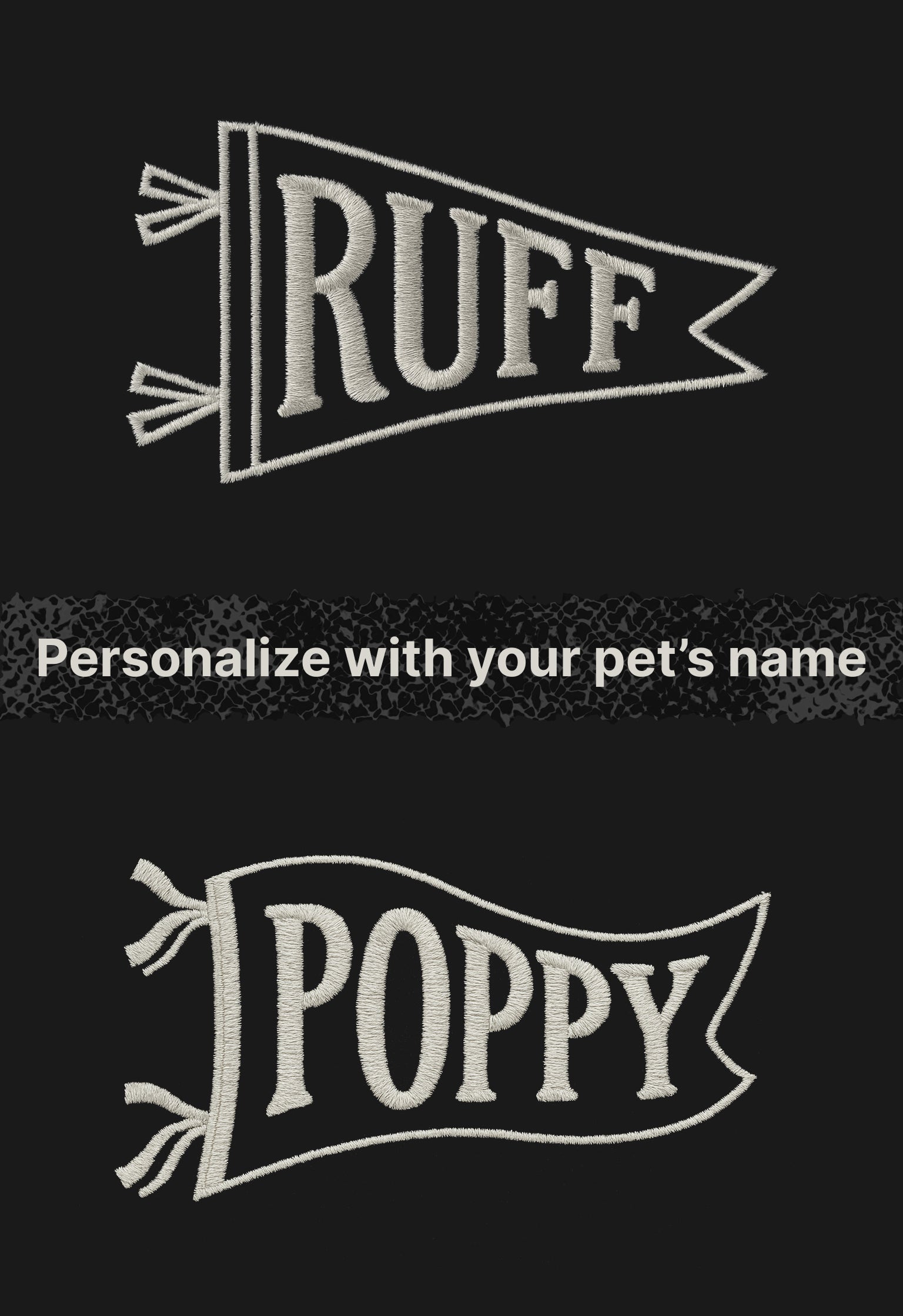 - Customizable front embroidered pennant with your pet’s name (or RUFF)