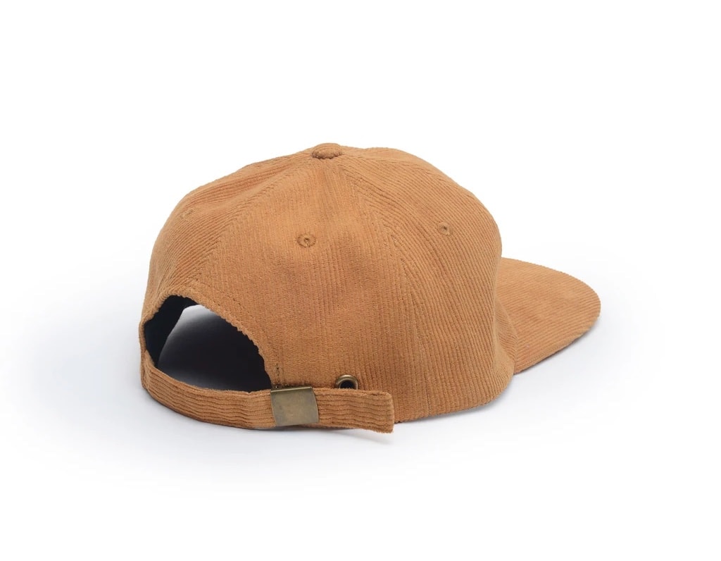 Rust unstructured corduroy hat with English Bulldog patch. This timeless hat is made of corduroy fabric and features a fabric strap with brass metal clasp.