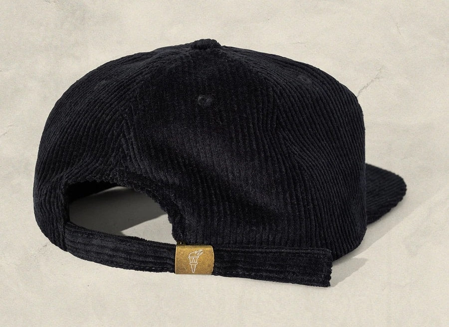 Black unstructured corduroy hat with Pug patch. This timeless hat is made of soft, corduroy fabric and features a fabric strap with brass metal clasp.