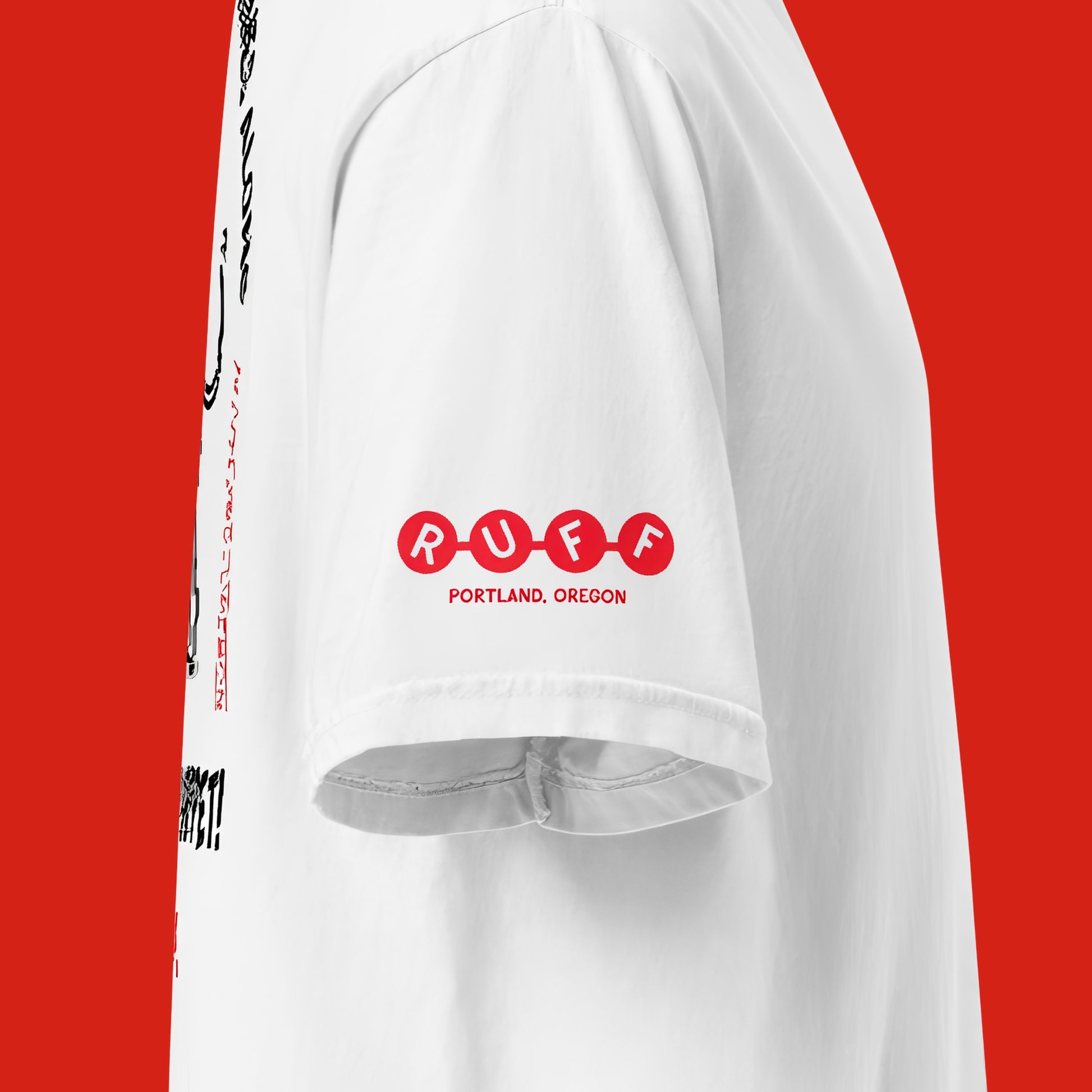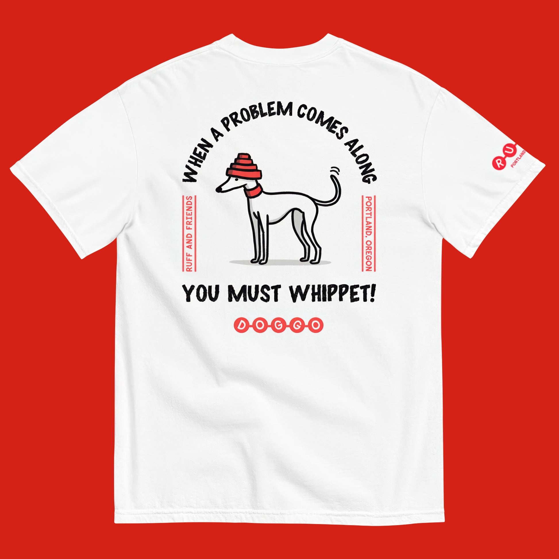 “When a problem comes along, you must Whippet!” This Devo-inspired tee blends iconic style with RUFF’s playful energy. Featuring a bold back print, a subtle chest graphic, and a “Doggo” detail on the sleeve, it’s a must-have for dog lovers and music fans alike.